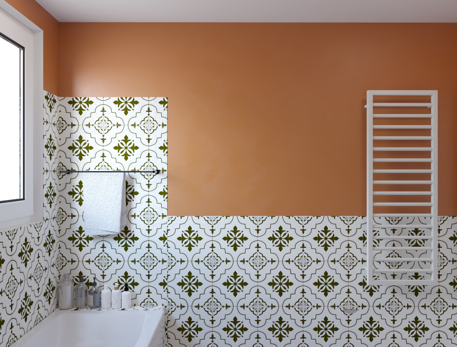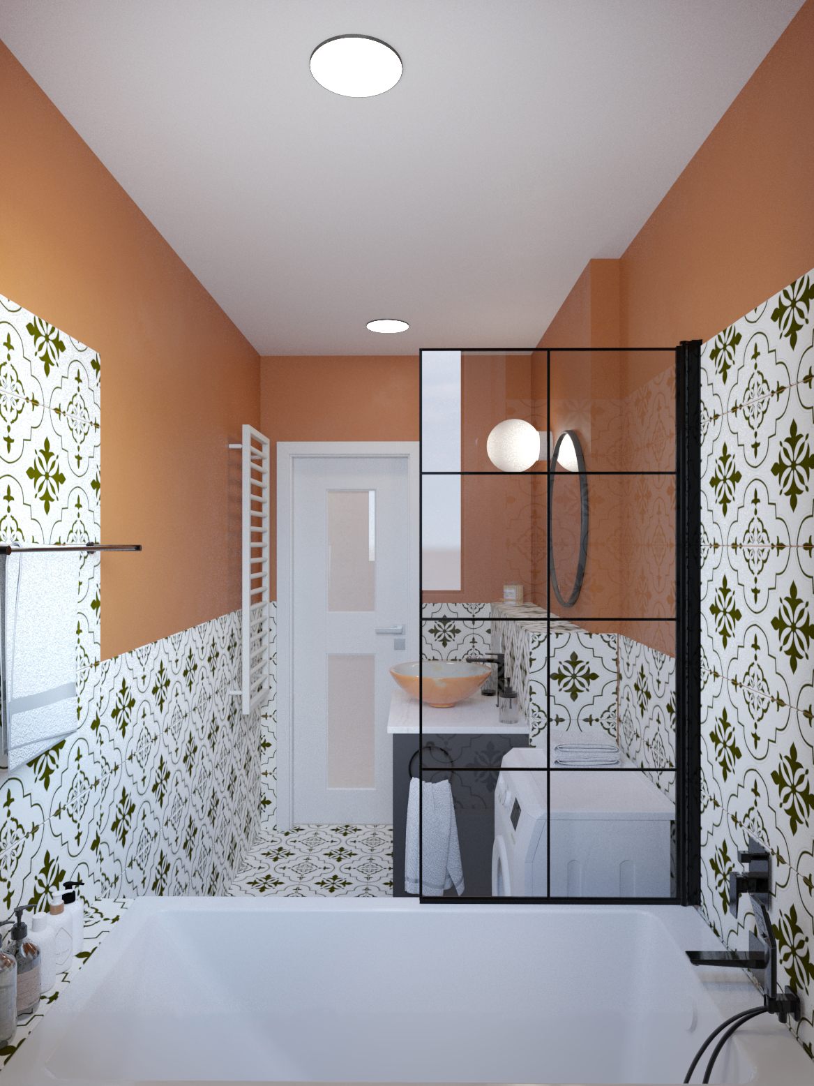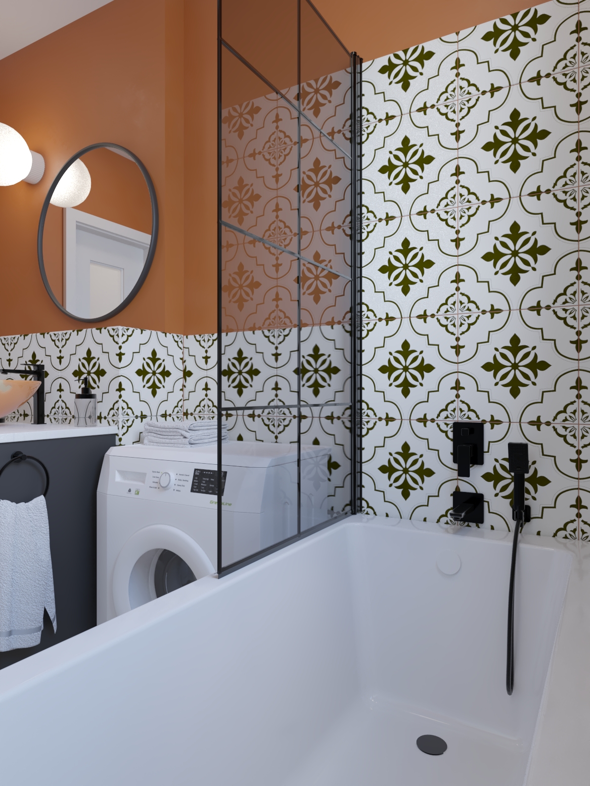 Łazienka stanowi śmiałą kontynuację stylistyki mieszkania. Zestawienie bieli, czerni, oliwkowej zieleni i terakoty tworzy mocny, a zarazem wyważony kontrast. Charakterystyczna mozaika nadaje jej wyrazistości, a czarne detale – takie jak armatura czy lustro – dopełniają całości.