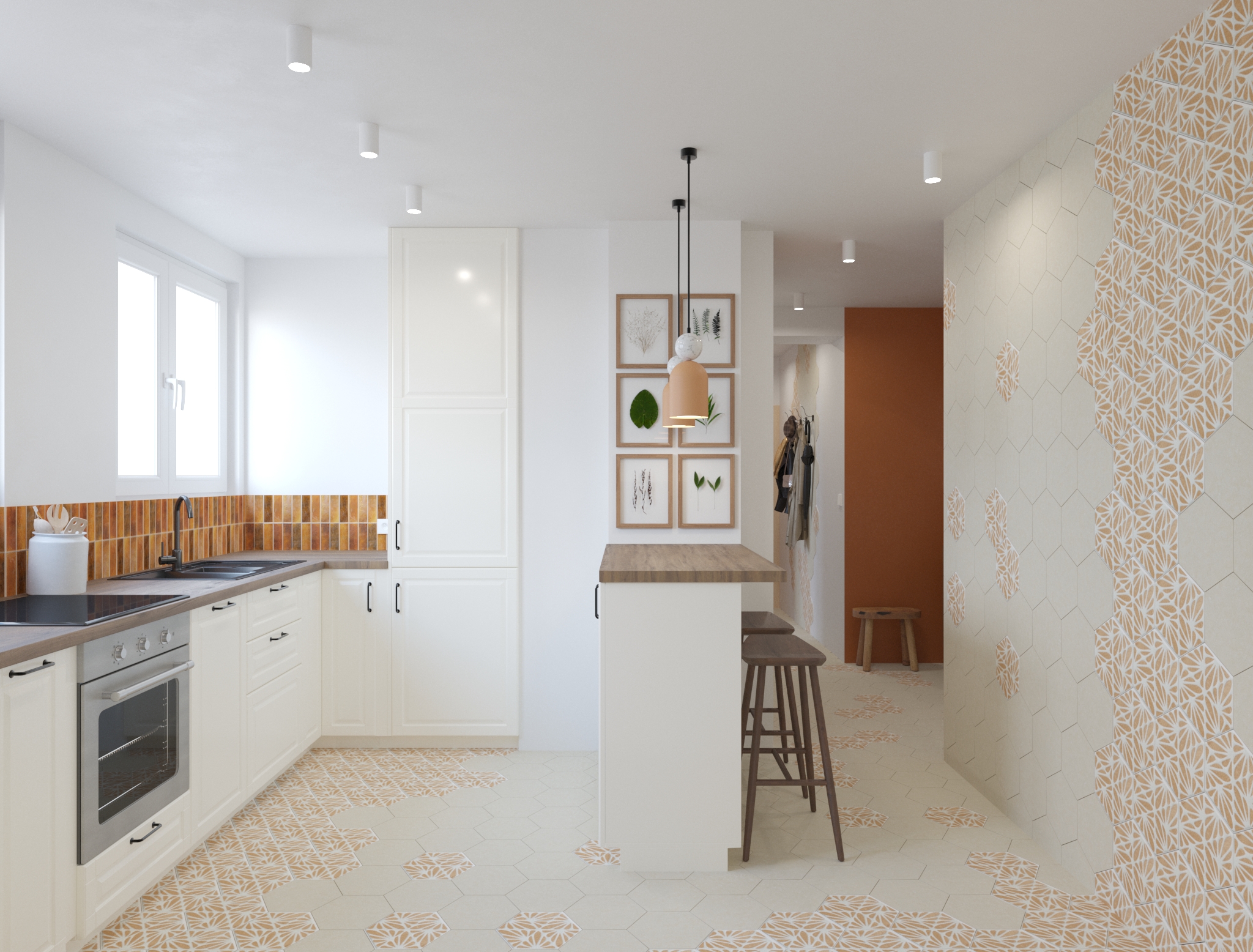 Kuchnia została zaprojektowana z myślą o funkcjonalności i spójnej estetyce. Białe fronty szafek w stylu klasycznym połączone są z płytkami w kolorze pomarańczowo-rdzawym oraz z geometryczną podłogą, która płynnie łączy się z dekoracyjną ścianą. Otwarte półki wprowadzają lekkość, a wysokie zabudowy gwarantują dużo miejsca do przechowywania.