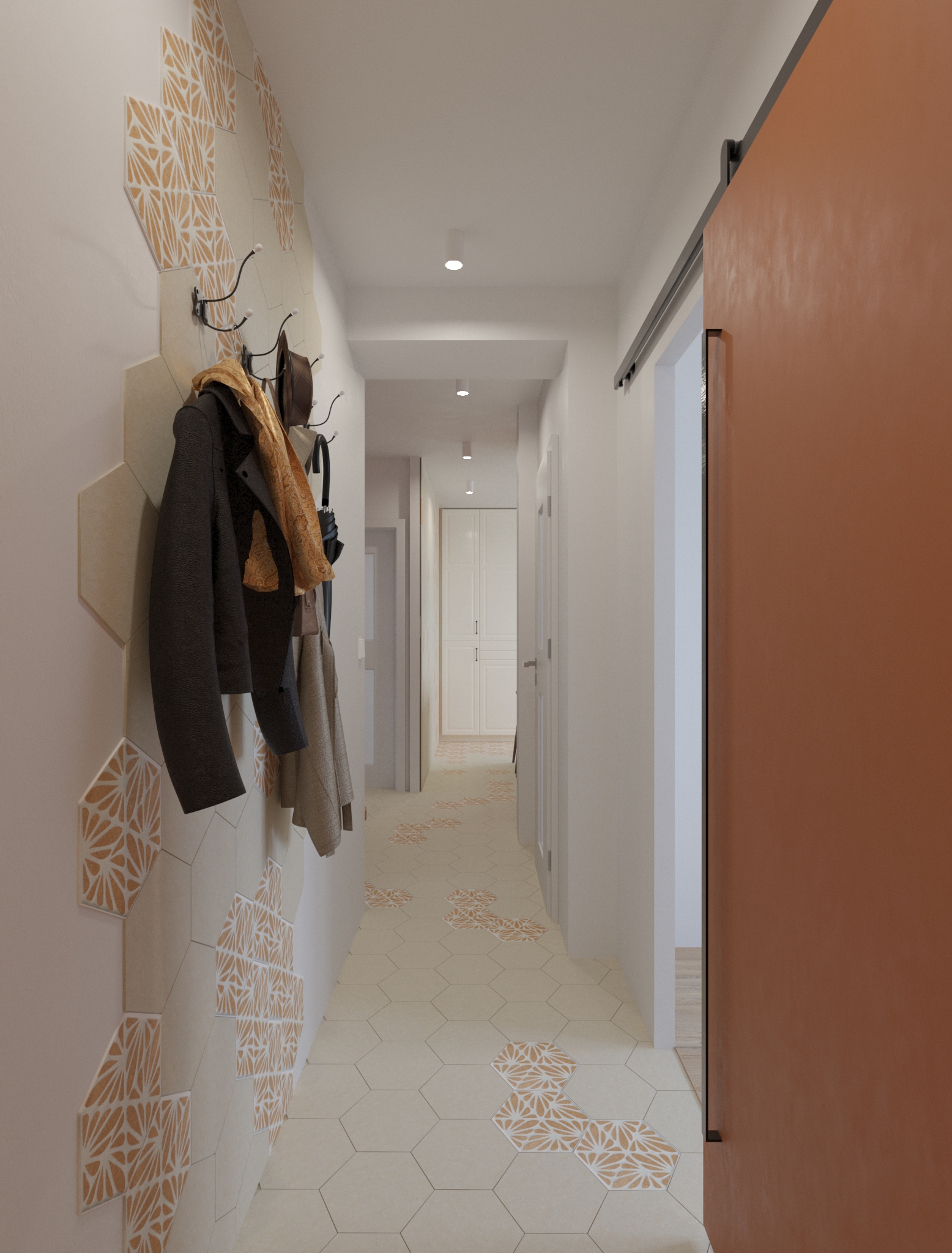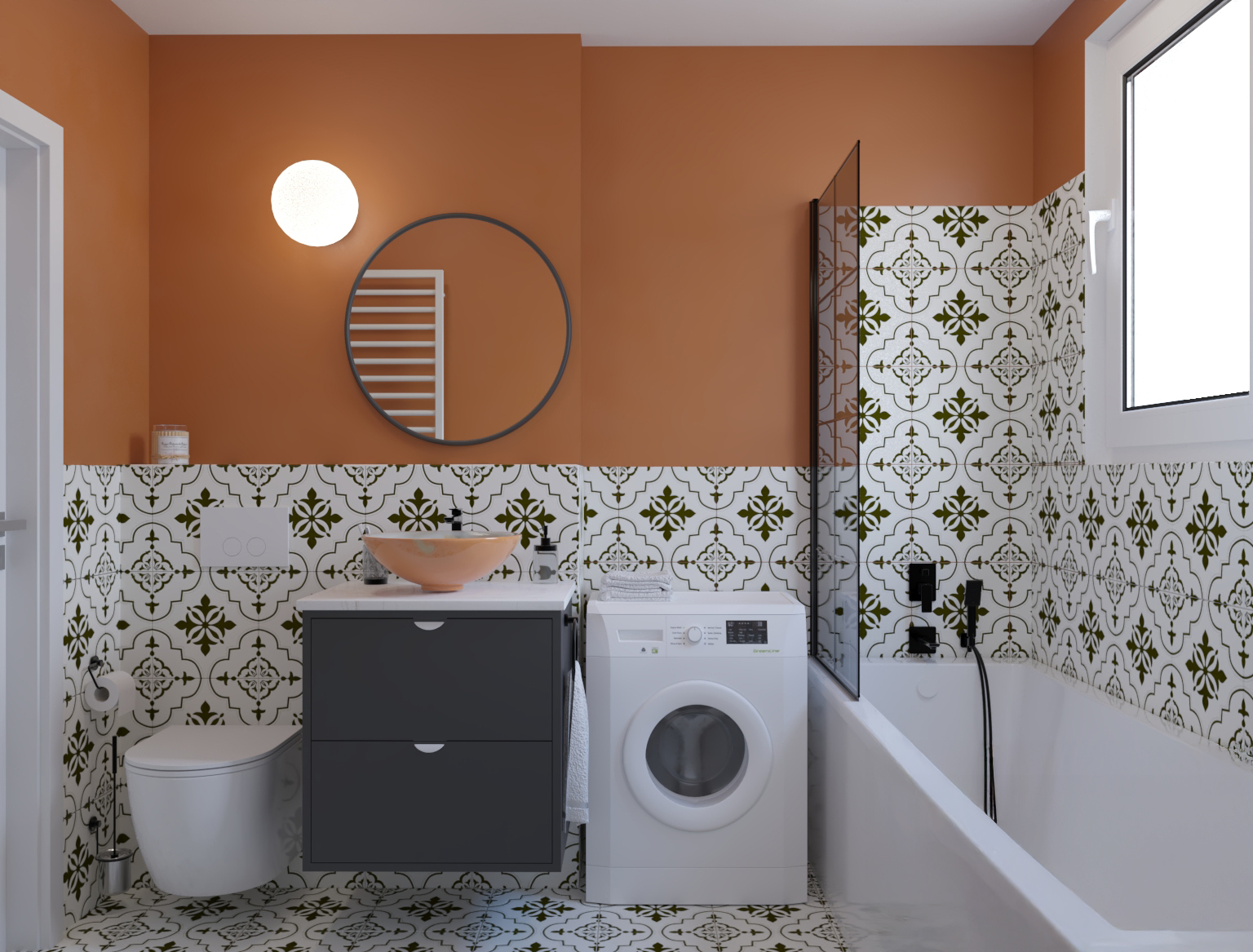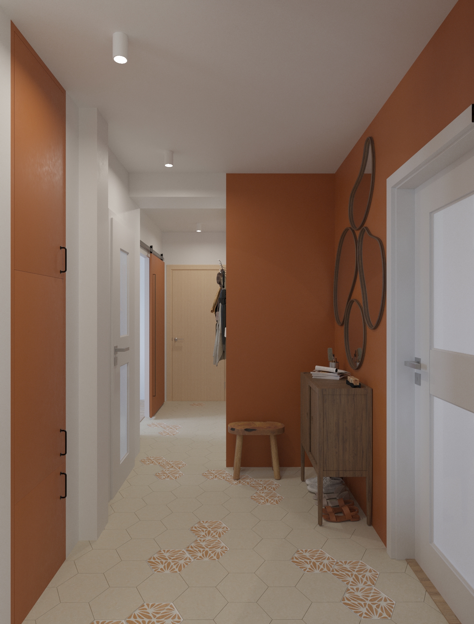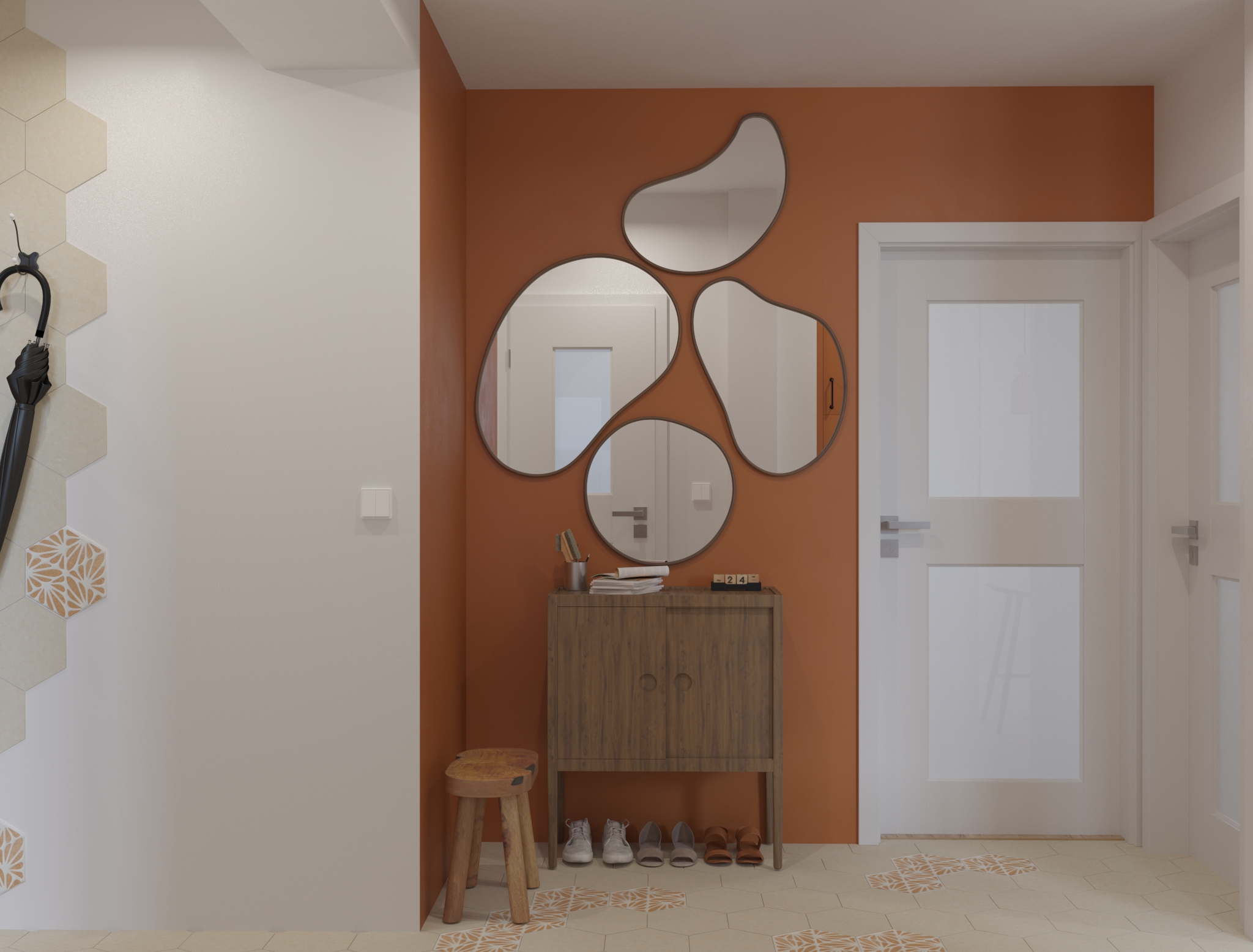 To wnętrze z pomarańczowymi dodatkami to połączenie nowoczesności i ciepła. Projekt obejmuje kuchnię, przedpokój oraz łazienkę, w których dominują stonowane biele i beże przełamane energetycznymi akcentami w kolorze terakoty. Geometryczne płytki, nietypowe lustra oraz dekoracyjne wykończenia tworzą spójną i wyrazistą przestrzeń. Całość utrzymana jest w harmonijnym stylu, łączącym funkcjonalność z indywidualnym charakterem mieszkańców.