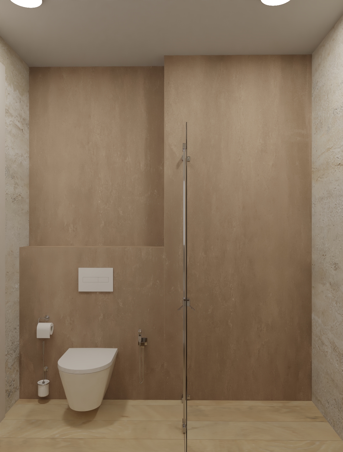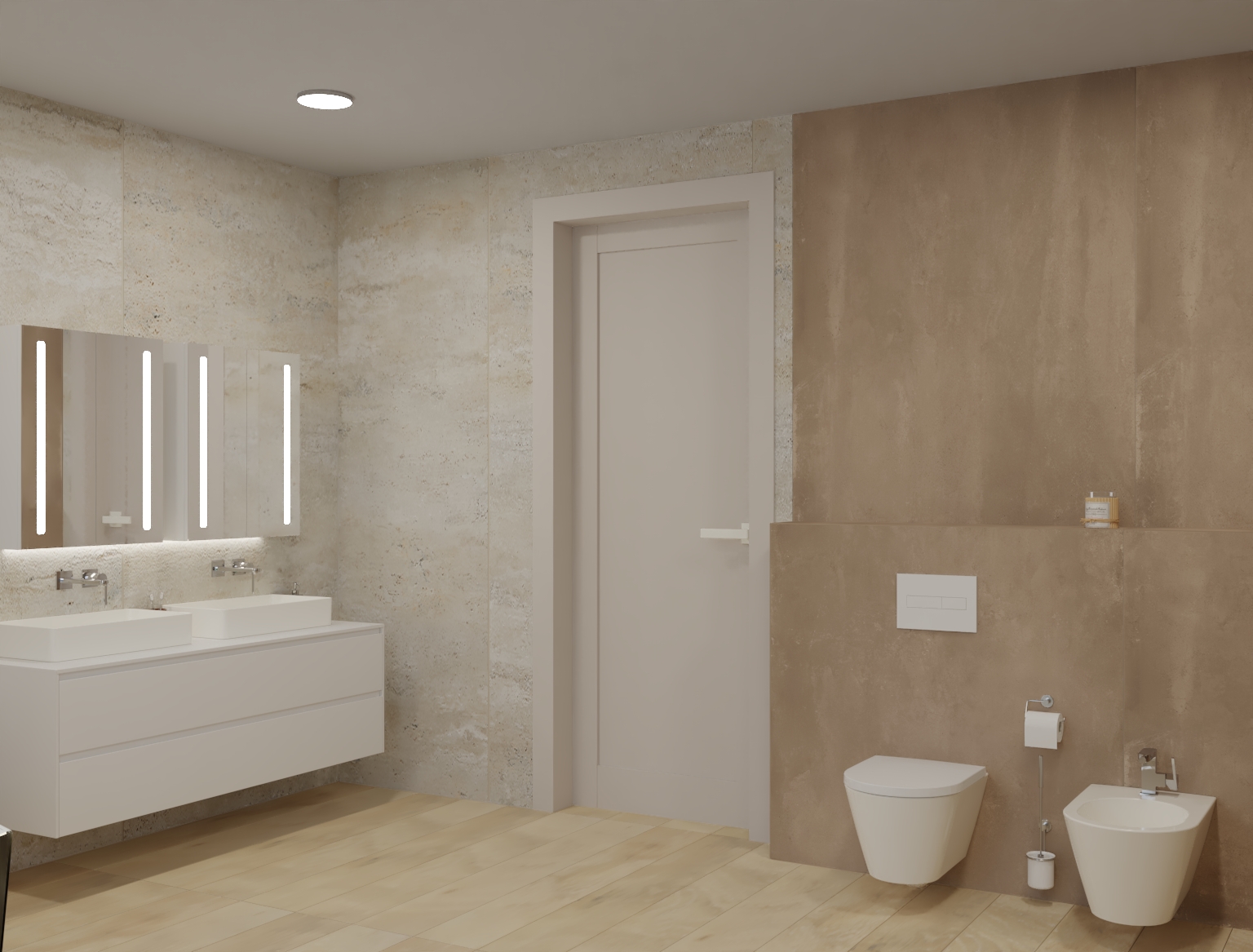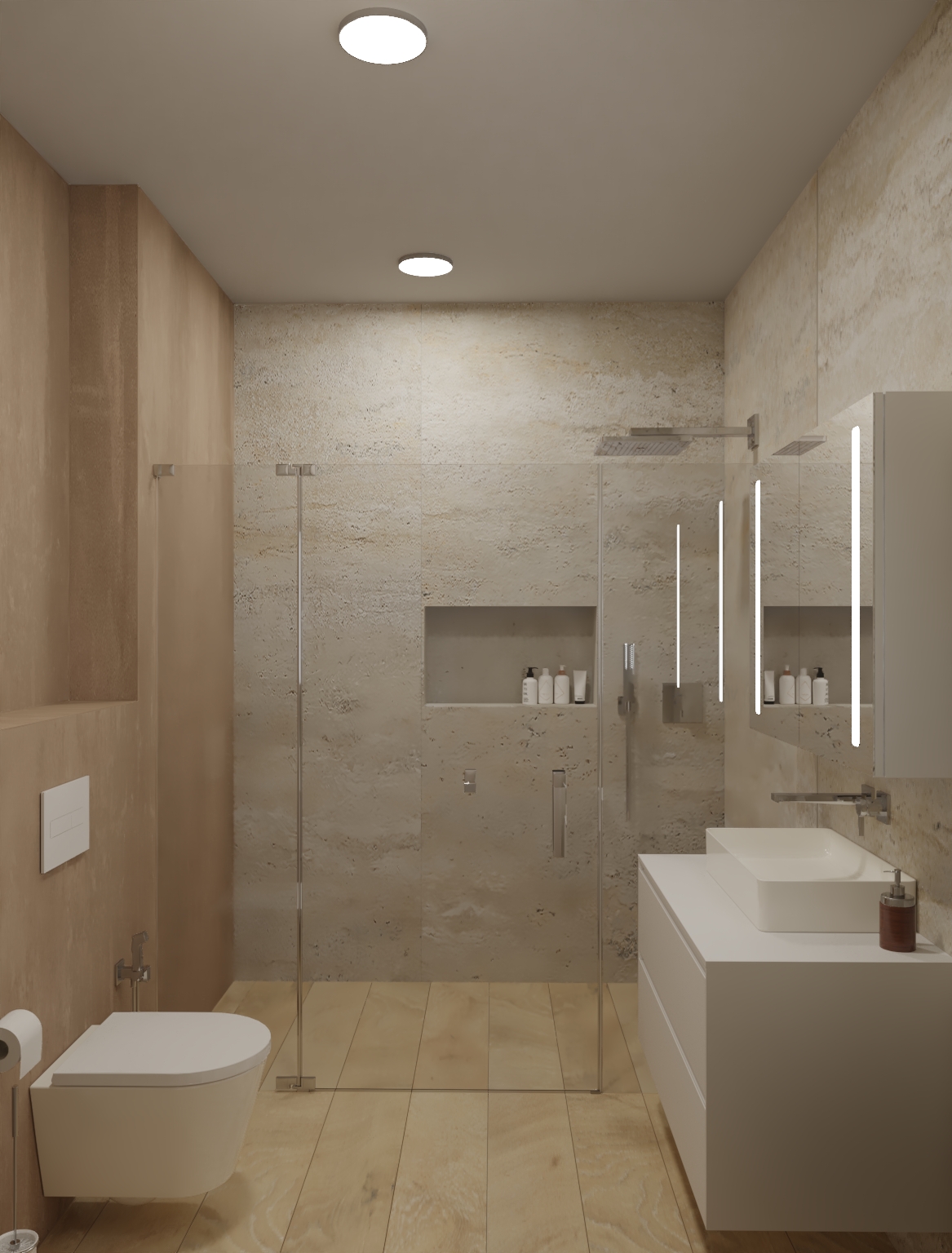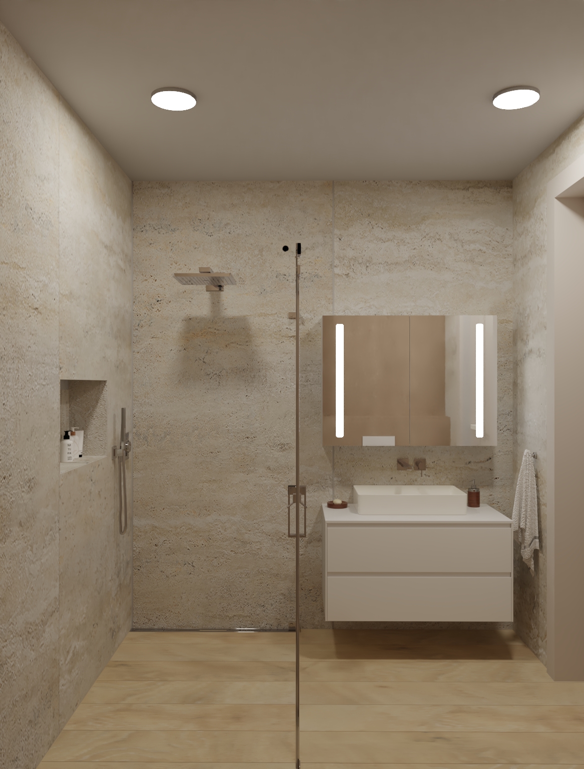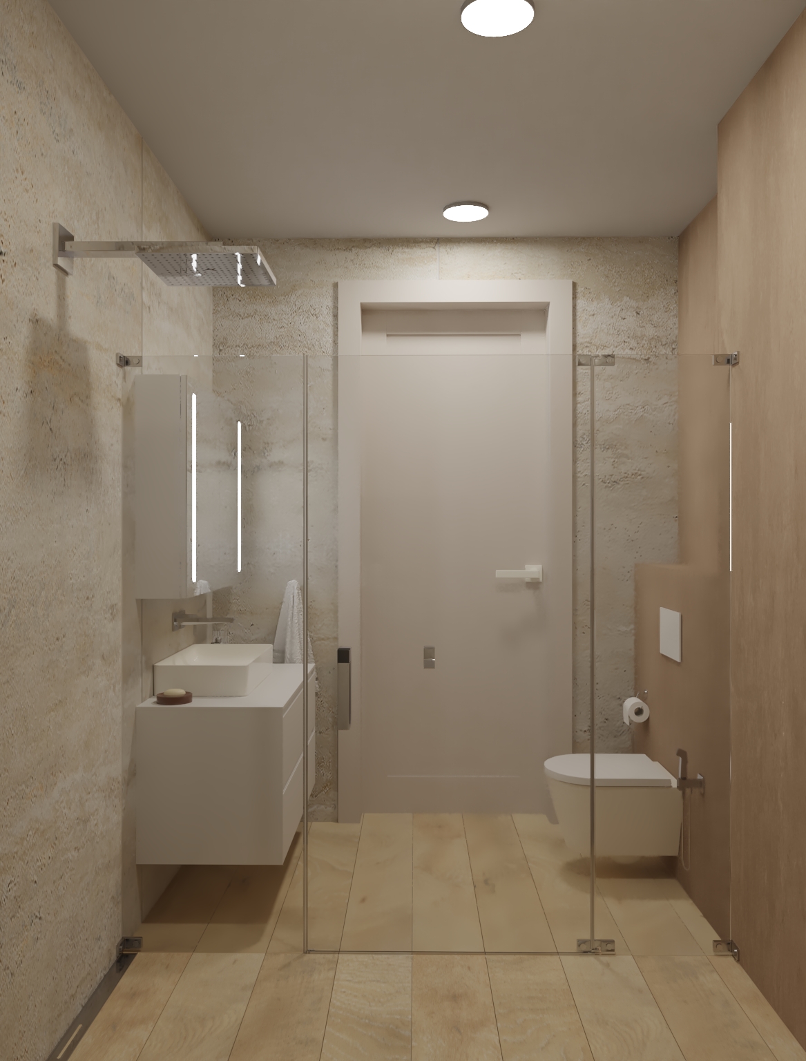 Projekt łazienek w Winowie to harmonijne połączenie nowoczesności i naturalnych materiałów. Główne role grają tutaj beże, piaskowe odcienie i drewno – zarówno na podłodze, jak i w detalach, takich jak zabudowy czy wejście do sauny. Jasne ściany z fakturą kamienia podkreślają spokojny i elegancki charakter wnętrza.
