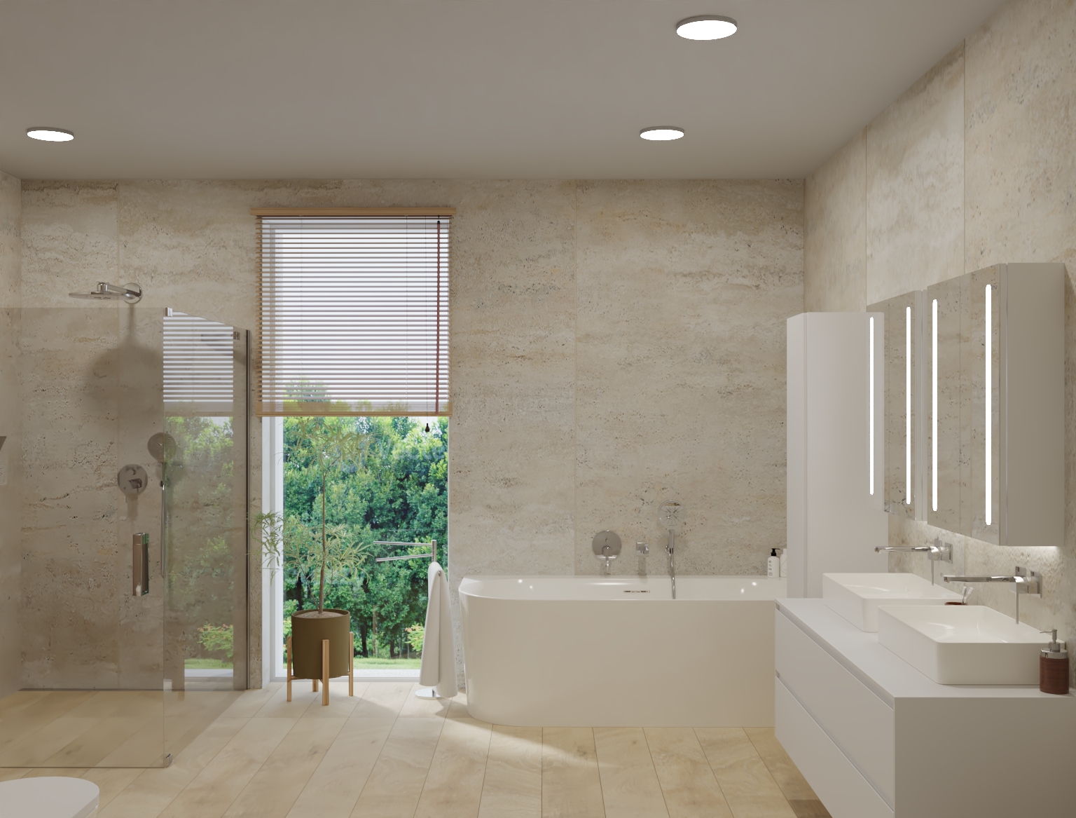 W strefie kąpielowej znajduje się wolnostojąca wanna, która dzięki umiejscowieniu przy dużym oknie oferuje relaks z widokiem na zieleń. Przestronny prysznic typu walk-in wyposażony jest w deszczownicę i niszę na kosmetyki, a całość uzupełnia roślinność, która dodaje wnętrzu życia.